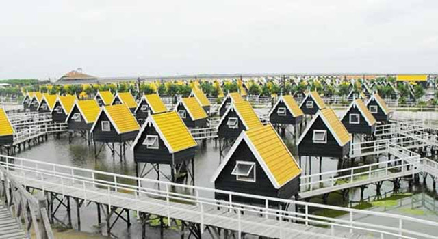 月坨島的建筑是仿荷蘭風(fēng)情而設(shè)計的,一座座紅頂小木屋,又叫情侶屋,懸空于海灘,與愛侶置身其中,諦聽大海的潮漲潮落,別有情趣。月坨島的浴場沙潔水凈,特別適宜海水浴,同時還有沙灘足球和準(zhǔn)備建設(shè)的跑馬場等娛樂場所,有海鮮燒烤、烤全羊、篝火晚會及海邊漁獵等體驗(yàn)野外生活的多種集體參與游玩項目,是避暑、度假、科考、春游、觀鳥的好去處。月坨島綠蔭植被廣覆,環(huán)境幽靜,鮮花野果散發(fā)出淡淡幽香,野生禽鳥、小型獸類繁多,幾近封閉的自然環(huán)境從未遭到人為的干擾與破壞,充滿野趣和情致。這里別致的荷蘭風(fēng)情建筑引人神往,紅頂木屋和綠野風(fēng)車在海天之間勾勒出一幅充滿異國情趣的浪漫畫卷。環(huán)島海灘沙質(zhì)潔凈,海水清碧,深度適宜,是天然良好浴場之所在。